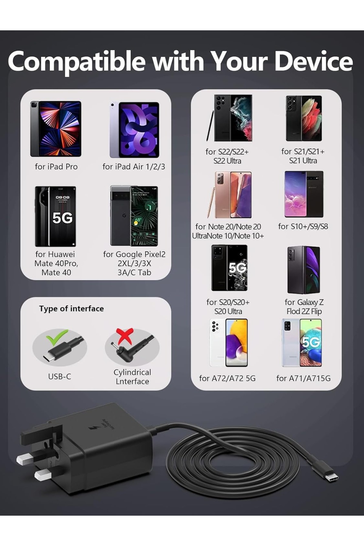 شاحن لهواتف سامسونج جالاكسي، رأس شاحن مع كابل شحن، 45 واط، S23 ألترا، S23 بلس، S23، S2
